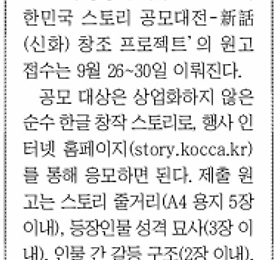 작가수첩/공모와 구인 썸네일형 리스트형 제2회 olleh 스마트폰영화제 공모 2월12일까지 상금 2천만원 KT에서 스마트폰 영화를 공모합니다. 10분짜리고 소정의 심사후 영화제를 연다고합니다. 상금은 1등 2천만원이라네요. 2월12일까지 내면 된다고 합니다. 출처: http://www.ollehfilmfestival.com 더보기 래몽래인, 신씨네 "엽기적인그녀" 16부작 미니시리즈공모전 3월30일 래몽래인 http://raemongraein.co.kr 에서 신씨네와 손잡고 16부작 미니시리즈 공모를 한다고 합니다. (출처: 서울신문 영화 ‘엽기적인 그녀’가 드라마로 만들어진다. 홍보사 와이트리미디어는 11일 ‘엽기적인 그녀’의 제작사 신씨네와 드라마 ‘성균관 스캔들’의 제작사 래몽래인이 손잡고 ‘엽기적인 그녀’를 제작한다고 밝혔다. 새달 1일부터 3월 30일까지 드라마 극본을 공모한다. 응모자격 제한은 없으며 16부작 미니시리즈의 시놉시스와 대본 2회분을 제출하면 된다. 내용은 제한이 없으나 반드시 영화 ‘엽기적인 그녀’를 모티프로 해야 한다. 접수는 이메일(raemongraein@ hanmail.net)과 우편으로 가능하다. 당선작에는 상금 1000만원을 준다. ) 더보기 2012년 드라마 극본, 영화 시나리오 공모일정 2012년 영화, 드라마 공모전 일정 by sheiswriter.tistory.com 공모전이름 주관사/주최사 마감일 공모요강 비고 (미정시 전년도) KBS 단막극공모 KBS 2012.8.31 70분 단막극 미니시리즈 공모 ? 16회시놉, 대본4회분 MBC 연속물공모 MBC 2012.7.27 1. 주간연속극4회분이나 " 일일연속극10회분 미니시리즈공모 2. 16회이상시놉, 대본2회분 SBS 미니시리즈공모 SBS 작년없었음 OCN TV미니시리즈 OCN 2012.2.10 장르물모집 (액션,수사,의학) 이번이 첫회 10부시놉시스, 대본2회분 막동이시나리오공모전 한석규 작년없었음 100분영화시나리오 매년봄 3월쯤 씨네21후원 비교적권위있음 영진위시나리오공모전 영진위 일정모호 100분영화시나리오 마켓에 통합되었다.. 더보기 OCN TV 미니시리즈(10부작) 공모 -2012년 2월 10일까지 OCN에서 장르물을 찾고 있습니다. 10부작 기획안과 대본 2회내면 되고 상금은 2천만원이네요. 한번 도전해볼마음이 마구마구 생기는군요 출처: http://ocn.cjmovies.co.kr/ocn/Schedule/Prime 더보기 [구인] TVN 예능작가모집 출처: http://tvn.lifestyler.co.kr/notice/notice_view.asp?bbscode=170&bbsID=94289578&curPage=1 tvN에서는 창의적이고 참신한 아이디어를 가진 신규프로그램 예능작가를 모집합니다! ⊙ 대상 : 나이, 학력 제한없음. 예능에 관심있는 사람 누구나 ⊙ 모집 일시 : 2011.11.3- 2011.12.3 ⊙ 모집 인원 : 00명 ⊙ 모집 방법 : [1차] 서류전형 * 제출서류: 이력서, 자기소개서, 아이디어 3건 제출 - 아이디어는 3가지 키워드 (올림픽, 대통령선거, 한류)중 1가지 선택, 나머지 2가지는 자유 - 아이디어는 각 아이디어 당 A4 1페이지 이내 [2차] 면접시험 [3차] 인턴 현장실습 * 면접 합격자는 1달간의 현장실습 후 작.. 더보기 2011 국립오페라단 창작팩토리사업 공모 (12월16일마감) 국립오페라단에서 오페라 극본과 완성품을 모집합니다. 몇년전에 희곡을 공모한 적이 있는데 이후로 꾸준히 공모소식이 이메일로 들어오고 있어서 올립니다. 그때는 희곡만 내도 됐었는데, 지금 보면 대본말고 악보도 내라는 것 같습니다. 자세한 것은 확인해 보시기 바랍니다. 이메일로 받은 첨부 파일을 올리겠습니다. 읽어보시면 알겠지만 상금이 3천만원입니다. 그리고 지원자들에게 오페라창작 지원 프로그램들을 자주 소개해 주니, 관심있는분 공모바랍니다. 더보기 2011 대한민국스토리 공모대전 (9월30일까지) 시놉시스만 60장을 쓰라네. 함 도전해 볼까? 미니시리즈 쓰던거 좀 줄거리 늘려볼까? 더보기 이전 1 2 3 다음